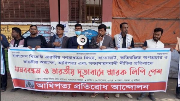 নিজস্ব প্রতিবেদকঃ অদ্য ১৫ই ডিসেম্বর রবিবার সকাল ১১ টায় আধিপত্য প্রতিরোধ আন্দোলনের উদ্যোগে বাংলাদেশের বিরুদ্ধে ভারতীয় গণমাধ্যমে মিথ্যা বানোয়াট অতিরঞ্জিত অপপ্রচার, ভারতীয় আধিপত্যবাদী আগ্রাসন ও সম্প্রসারণবাদ নীতির প্রতিবাদে নতুন বাজার
