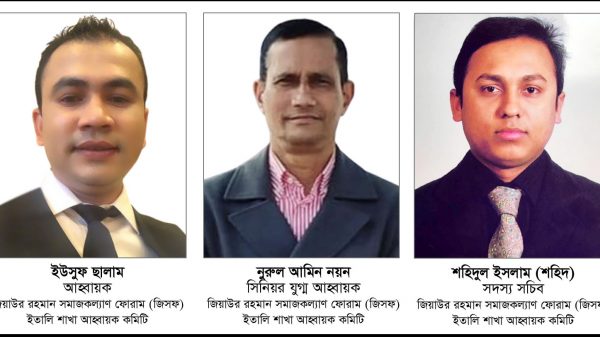 নিজস্ব প্রতিবেদকঃ ইউসুফ ছালাম কে আহ্বায়ক, নুরুল আমিন নয়ন কে সিনিয়র যুগ্ম আহ্বায়ক ও শহিদুল ইসলাম (শহিদ) কে সদস্য সচিব করে জিয়াউর রহমান সমাজকল্যাণ ফোরাম (জিসফ) ইতালি শাখার ২১ সদস্য