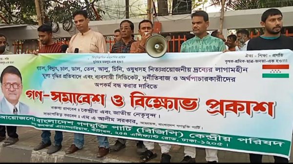 নিজস্ব প্রতিবেদকঃ বাংলাদেশ গণমুক্তি পার্টির উদ্যোগে ৬ ডিসেম্বর শুক্রবার সকালে জাতীয় প্রেসক্লাবের সামনে গ্যাস, বিদ্যুৎ, চাল, ডাল, তেল, আলু, চিনি, ঔষধসহ নিত্যপ্রয়োজনীয় দ্রব্যের লাগামহীন মূল্যবৃদ্ধির প্রতিবাদে এবং ব্যবসায়ী সিন্ডিকেট, দুর্নীতিবাজ