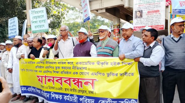নিজস্ব প্রতিবেদকঃ ৩ ডিসেম্বর ২০২৪ (মঙ্গলবার) সকাল ১০:৩০ মিনিটে জাতীয় প্রেসক্লাবের সামনে নন-এমপিও শিক্ষা প্রতিষ্ঠান শিক্ষক-কর্মচারী পরিষদের উদ্যোগে স্বীকৃতিপ্রাপ্ত সকল নন-এমপিও শিক্ষাপ্রতিষ্ঠান একযোগে এমপিওভুক্তির দাবিতে মানববন্ধন অনুষ্ঠিত হয়। মানববন্ধনে নন-এমপিও