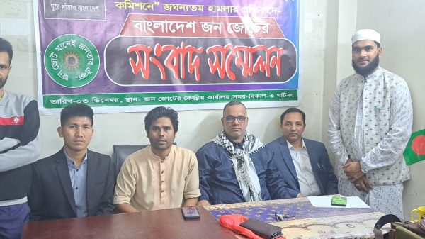 নিজস্ব প্রতিবেদকঃ আজ বাংলাদেশ জন জোটের কেন্দ্রীয় কার্যালয়ে ” ভারতের আগরতলায় বাংলাদেশ উপ- হাইকমিশনে হামলার প্রতিবাদে সংবাদ সম্মেলনে অনুষ্ঠিত হয় । বাংলাদেশ জন জোটের আহবায়ক মুজাম্মেল মিয়াজীর সভাপতিত্বে উক্ত সংবাদ