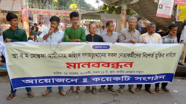 নিজস্ব প্রতিবেদকঃ আজ বৃস্পতিবার ২৮ নভেম্বর ২০২৪ সকাল ১১টায় জাতীয় প্রেসক্লাব সম্মুখে কয়েকটি সংগঠনের উদ্যোগে আ ব ম মোস্তফা আমীনসহ অহিংস গণঅভ্যুত্থানের সকল নেতাকর্মীদের নিঃশর্ত মুক্তির দাবিতে মানববন্ধন অনুষ্ঠিত হয়।