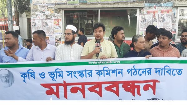 নিজস্ব প্রতিবেদকঃ মঙ্গলবার সকাল ১১ টায় জাতীয় প্রেসক্লাবের সামনে বাংলাদেশ ভূমিহীন আন্দোলনের উদ্যোগে “কৃষি ও ভূমি সংস্কার কমিশন গঠনের দাবিতে মানববন্ধন” অনুষ্ঠিত হয়। সভাপতির বক্তব্যে বাংলাদেশ ভূমিহীন আন্দোলনের কেন্দ্রীয় সাধারণ