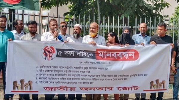 নিজস্ব প্রতিবেদকঃ আজ ২২ ই অক্টোবর রোজ মঙ্গলবার সকাল ১১ টায় জাতীয় জাদুঘরের সামনে জাতীয় জনতার জোট এর ডাকে ৫ দফা দাবিতে মানববন্ধন অনুষ্ঠিত হয়। অনুষ্ঠানে জাতীয় জনতার জোটের আহ্বায়ক