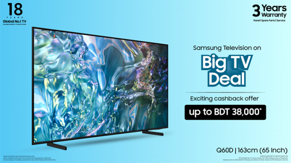 নিজস্ব প্রতিবেদকঃ ডি-সিরিজের টেলিভিশনে বড় অঙ্কের ক্যাশব্যাক অফারের ঘোষণা দিয়েছে শীর্ষস্থানীয় কনজ্যিউমার ইলেকট্রনিক্স ব্র্যান্ড স্যামসাং! এই অফারের অংশ হিসেবে ডি সিরিজের কয়েকটি মডেলে ১৮ হাজার থেকে ৩৮ হাজার টাকা পর্যন্ত