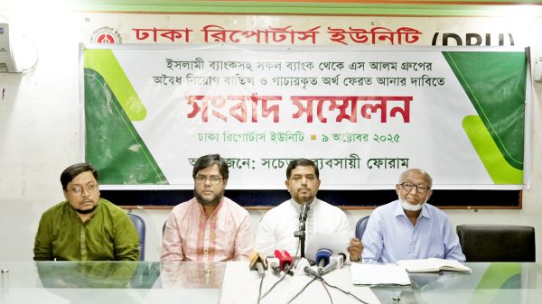 এস আলম গ্রুপ কর্তৃক পাচারকৃত অর্থ ফেরত আনয়ন এবং ইসলামী ব্যাংকসহ অন্যান্য ব্যাংকে অবৈধভাবে নিয়োগকৃত কর্মকর্তা-কর্মচারীদের নিয়োগ বাতিলের দাবিতে ৯ অক্টোবর ২০২৫, বৃহস্পতিবার সচেতন ব্যবসায়ী ফোরামের উদ্যোগে ঢাকা রিপোর্টার্স ইউনিটিতে