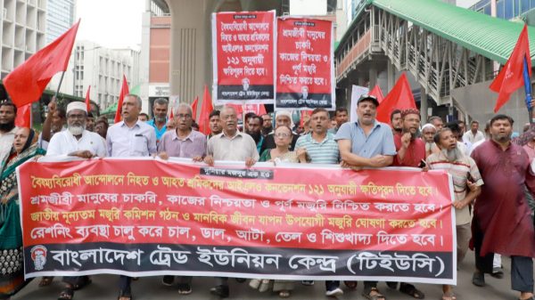 নিজস্ব প্রতিবেদকঃ বৈষম্য বিরোধী আন্দোলনে শ্রমজীবীসহ নিহত-আহতদের ক্ষতিপূরণ, জাতীয় ন্যুনতম মজুরি কমিশন গঠন করে মানবিক জীবন যাপন উপযোগী ন্যুনতম মজুরি ঘোষণা, রেশনিং প্রথা চালু করে শ্রমিক-কর্মচারীদের মধ্যে নিত্যপ্রয়োজনীয় দ্রব্যাদি সরবরাহ,