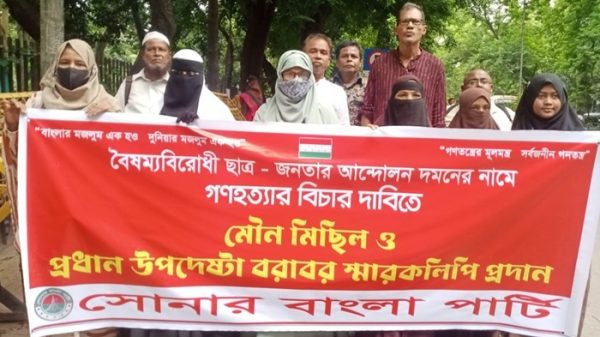নিজস্ব প্রতিবেদকঃ ১৭ আগস্ট’২৪ শনিবার সকাল ১১ ঘটিকায় সেগুনবাগিচা তোপখানা রোডস্থ প্রেস কাউন্সিল থেকে সোনার বাংলা পার্টি’র সাধারণ সম্পাদক সৈয়দ হারুন-অর-রশীদ এর নেতৃত্বে একটি মৌন মিছিল পল্টন মোড় ঘুরে জাতীয়
