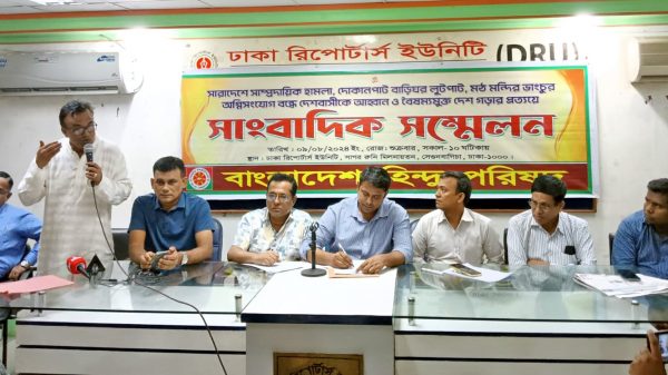 নিজস্ব প্রতিবেদকঃ ০৯ আগস্ট ২০২৪ খ্রিঃ তারিখ শুক্রবার সকাল ১১.০০ ঘটিকায় বাংলাদেশ হিন্দু পরিষদের উদ্যেগে সারাদেশে সাম্প্রদায়িক হামলা, দোকানপাট, বাড়িঘর লুটপাট, মঠমন্দির ভাংচুর, অগ্নিসংযোগ বন্ধে দেশবাসীকে আহবান ও বৈষম্যমুক্ত দেশ