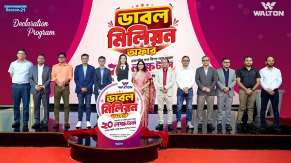 নিজস্ব প্রতিবেদকঃ সারা দেশে ‘ডিজিটাল ক্যাম্পেইন সিজন-২১’ শুরু করছে গ্লোবাল ইলেকট্রনিকস ব্র্যান্ড ওয়ালটন। ক্যাম্পেইনের এই সিজনেও ওয়ালটন পণ্যের ক্রেতাদের জন্য থাকছে বিশেষ চমক। সিজন-২১ এ ক্রেতাদের জন্য ‘ডাবল মিলিয়ন’ অফার